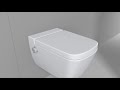 Унитаз является подвесным и безободковым, а гигиенический душ работает без использования электричества, что делает его эффективным и экономичным. Встроенные поворотные регуляторы позволяют легко устанавливать температуру и напор воды, а самочистящиеся форсунки гигиенического душа гарантируют максимальную гигиену.